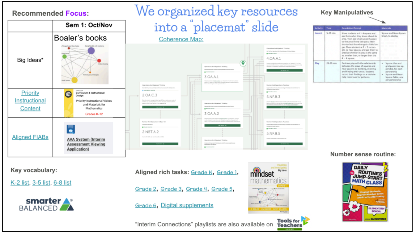 - Curated digital placemats — interactive, grade-level math resources that combined aligned Focused Interim Assessment Blocks (FIABs), key vocabulary, manipulatives, rich tasks, and vertical coherence maps